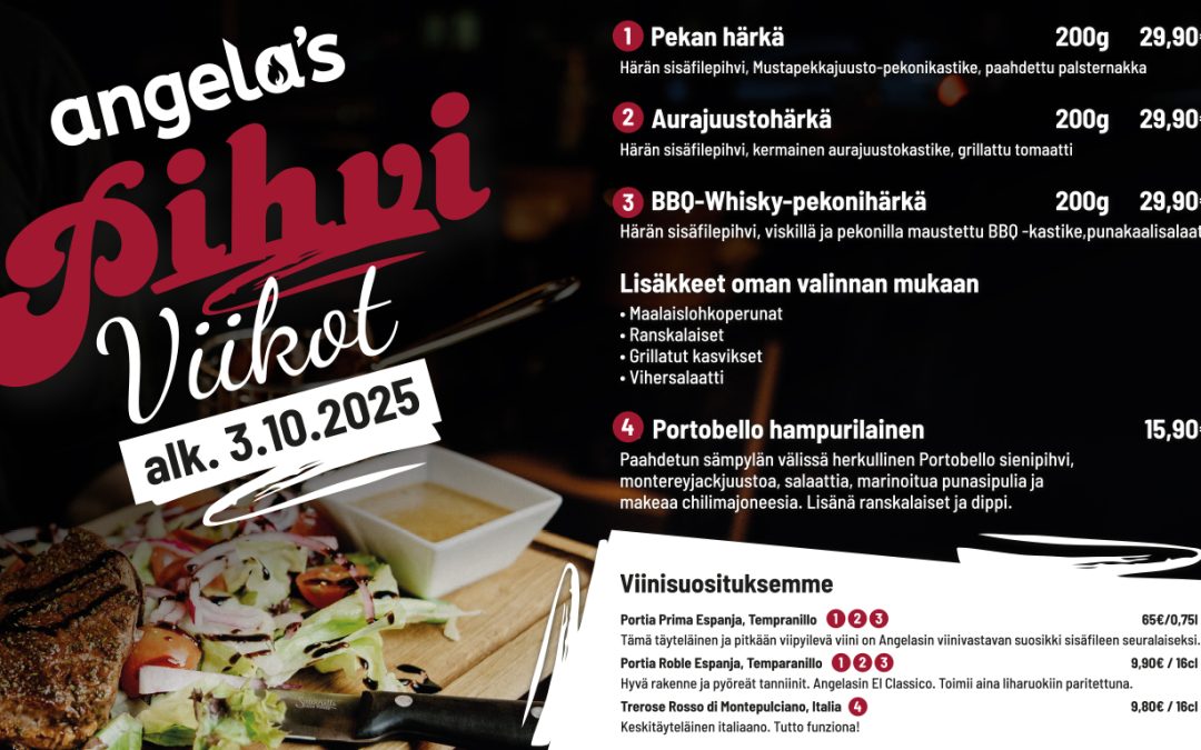 Ravintolan Angela'sin pihviviikot ovat täällä! Hyvä pihvi. Parempi viini. Paras seura. Tämä kolmikko ei mene koskaan pois muodista! Ota ystäväsi ja tulkaa nauttimaan!